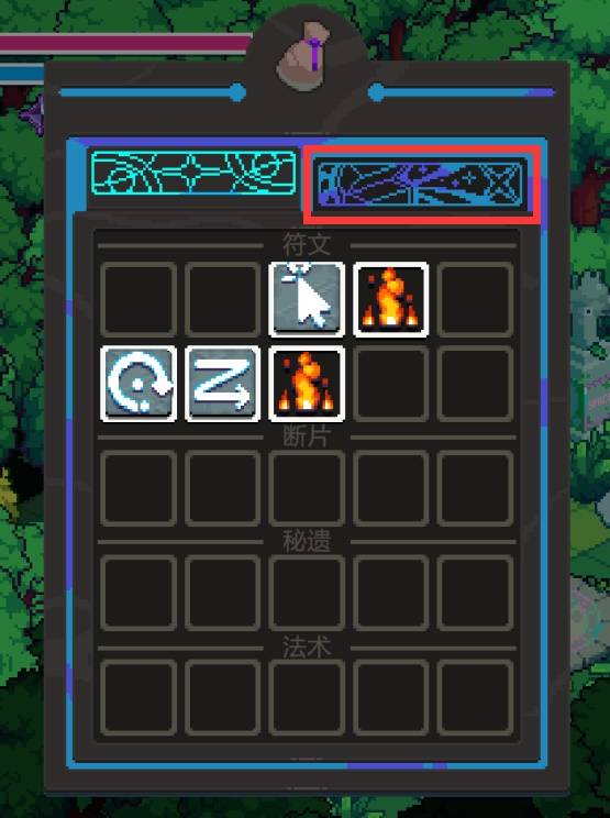 左侧是背包的物品栏,能够查看符纹、断片、秘遗、法术,点击红色方框位置会切换至装备页面。