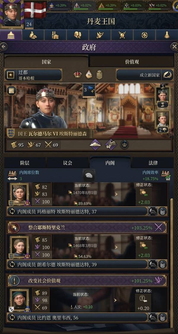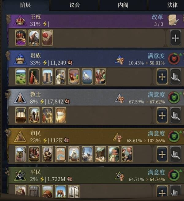 这个时代我们的首要任务是快速扩张,遏制其余欧陆霸权,上岛,神罗,俄罗斯三个方向。其次,快速调整我们的社会价值观念,腐朽的东西,你离开吧。首先在法律和特权上调整,增加有利于创新,人文,财阀,资本的。三等分的权柄体感十分舒适,努力提高市民影响力,狠狠降低教士,***收不上来税。