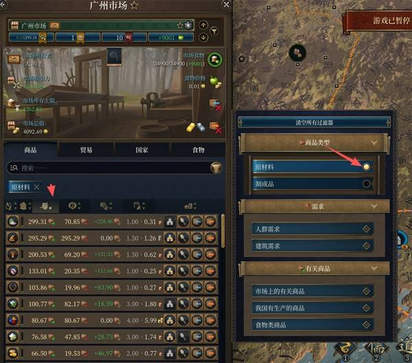最直观的办法,是从城镇界面点开其所属的市场,然后在选择按供给排序并点上原材料过滤器