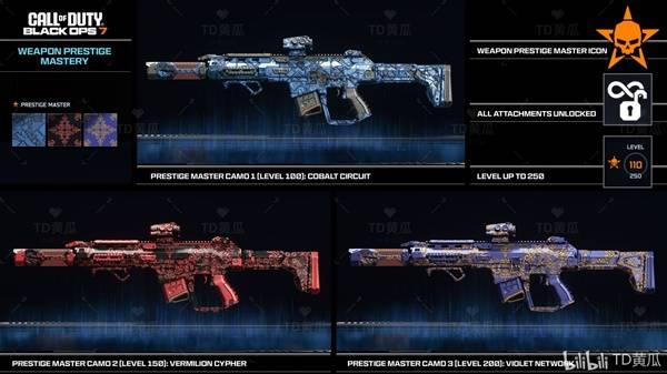 在等级达到100/150/200时,将解锁3个巅峰大师迷彩,这3个迷彩并非通用,只能用在该武器上,但可在任何模式中使用。