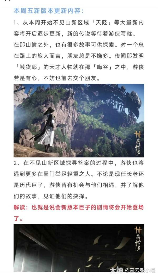 本周更新内容:不见山新区域【天陉】,4款新外观爆料,新武器【手甲】,新流派【破竹鸢】,手甲武学【天志垂象】、绳镖武学【千机索天】