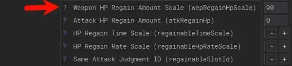 这里面其实目前我只明确动作回血倍率和词条倍率两个参数,词条倍率就不说了,就是表里的1/1.25/1.35,动作回血倍率解包可以看到是wepRegainHpScale