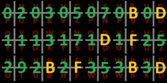 然后需要将2077中电脑的符号换算成字母,然后将每个2*2的网格用2-61的质数表示,然后再进行16进制的转化可以得到上图内容。