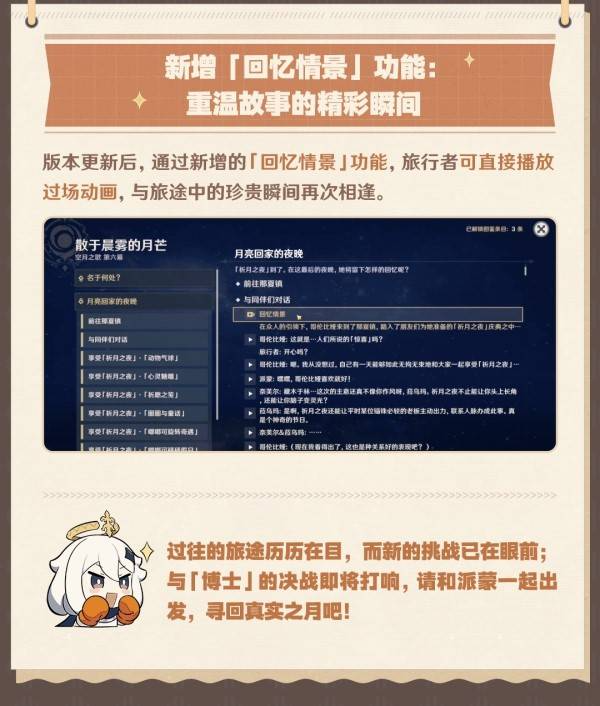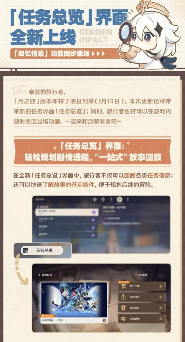 《原神》6.3月之四版本新增了“任务总览界面”和重看过场动画功能,下面就为大家带来《原神》6.3月之四系统优化及更新内容汇总,一起来了解一下吧。