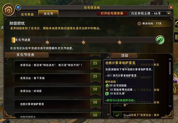 任务本身就具备了丰富的玩法,包括制造、采集、探险,以及完成地下城和团队副本。我们希望的是,不论玩家喜欢以何种方式体验《魔兽世界》,他们都能有机会为文化节做出贡献。成功完成任务不仅可以获得任务本身的奖励,还能获得所有文化节通用的文化节货币,以及邻里青睐。