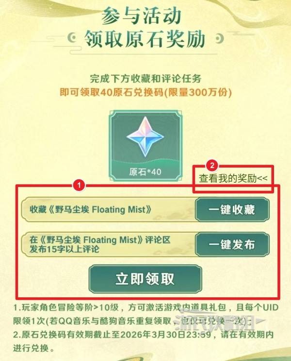温馨提示:玩家角色冒险等阶≥10级,方可激活游戏内道具礼包,且每个UID限领1次(若QQ音乐与酷狗音乐重复领取,也仅可兑换一次);原石兑换码有效期截止至2026年3月30日23:59,请在有效期内进行兑换。*活动页面内部分数据更新存在1分钟延迟,延迟后会自动刷新,请旅行者们稍候
