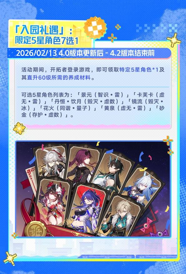 其中,限定5星角色7选1!开拓者登录游戏,即可领取特定5星角色*1及其直升60级所需的养成材料。