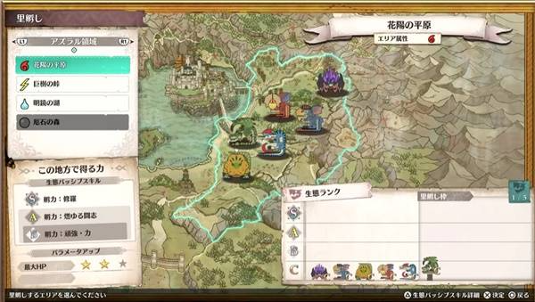 以下内容都是个人针对英文PV的图片进行的解析,具体系统以官方为准首先,每个生态地图都存在着1个赋予属性,3个生态技能和2个数值提升效果。例如下图的花阳平原,赋予属性是火属性,生态技能是S级别的修罗,A级别的燃烧斗志,B级别的顽强【力】,数值提升效果为最大HP提升2级那么,在此地诞生的随从,就可以获得对应的赋予属性、生态技能和数值提升效果。