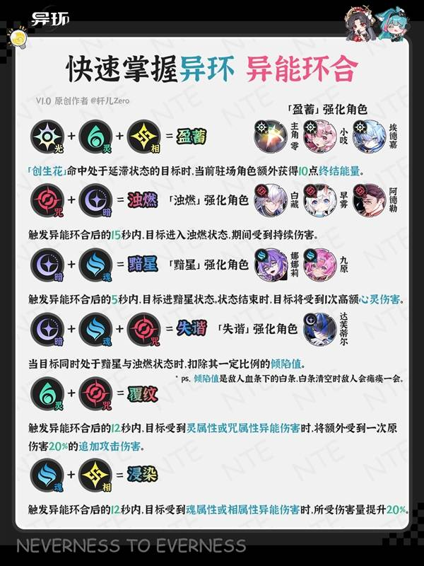 第二页为异能环合触发方式,攒满环合值切能环合的角色即可触发,第三页为异能环合类型效果,除覆纹和浸染外,其余6种异能环合可根据角色的援护技被动进行强化。因此异环配队一般就可以根据环合类型来进行搭配。