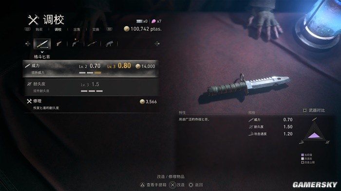 考虑到其强劲性能,加入耐久度的设定也是必然的。也不必担心它不够耐用,在整个通关过程中我只有两次将小刀用到彻底损坏。且在商人处花费少量金钱即可将其维修,还能在地图中寻找到消耗性的临时小刀。