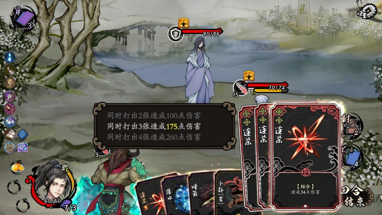 其次,《兰若异谭》又引入了类似“斗地主”的对子、炸弹等机制——同时打出复数张“组合牌”,就可以发动更为强大的卡牌效果。这让游戏略有缺失的策略意味,又从留牌与出牌中得到了平衡。