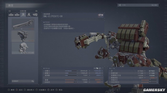 在《装甲核心VI》中,玩家可同时在机甲中搭载四种包括激光刃、机炮、导弹、护盾等不同的武器,不同装备的特性适用于不同的关卡场景。例如在杂兵较多的场景中,备弹量大,命中率高的武器会更舒服。而在Boss战中,冲击力强,能迅速累积冲击力量表的武器则会更加得心应手。