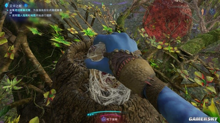 包括《潘多拉》中独特的采摘系统也是如此。当你想从珍稀植物上摘些果实、或是掰点树枝时,你都会进行一套类似于《上古卷轴5》中开锁的互动操作:你要先轻轻握住果实,通过转动摇杆观察出正确的方向,再大力一拽——就能获得一颗品质完美的果实。而要是你乱按一通,生拉硬扯,那么最后获得的果实品质也会有所减损。