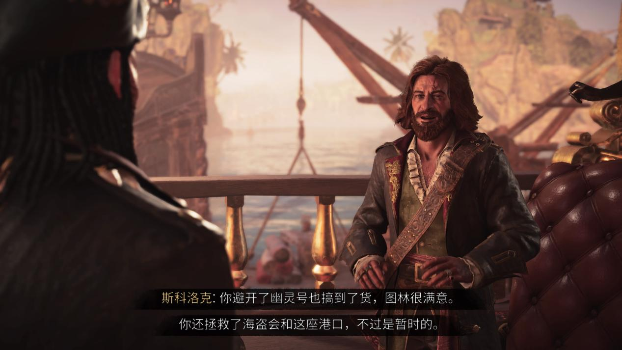 答案也是否定的。虽然《碧海黑帆》名义上存在一条主线剧情,负责引导玩家成长为游戏中最顶尖的海盗,但其制作的敷衍程度,并不比国内那些换皮武侠网游好到哪去。游戏在目前的版本进度中,仅有两位主要的剧情NPC负责给玩家派发主线任务,而剧情对这两位海盗头子的塑造,差不多也就是AI写剧本的水准。虽然牛皮没少吹,狠话没少放,但在流程中他们终究只是个上不了台面的工具人,十几个任务做下来,我脑海里愣是没有对他们留下任何鲜明的印象。