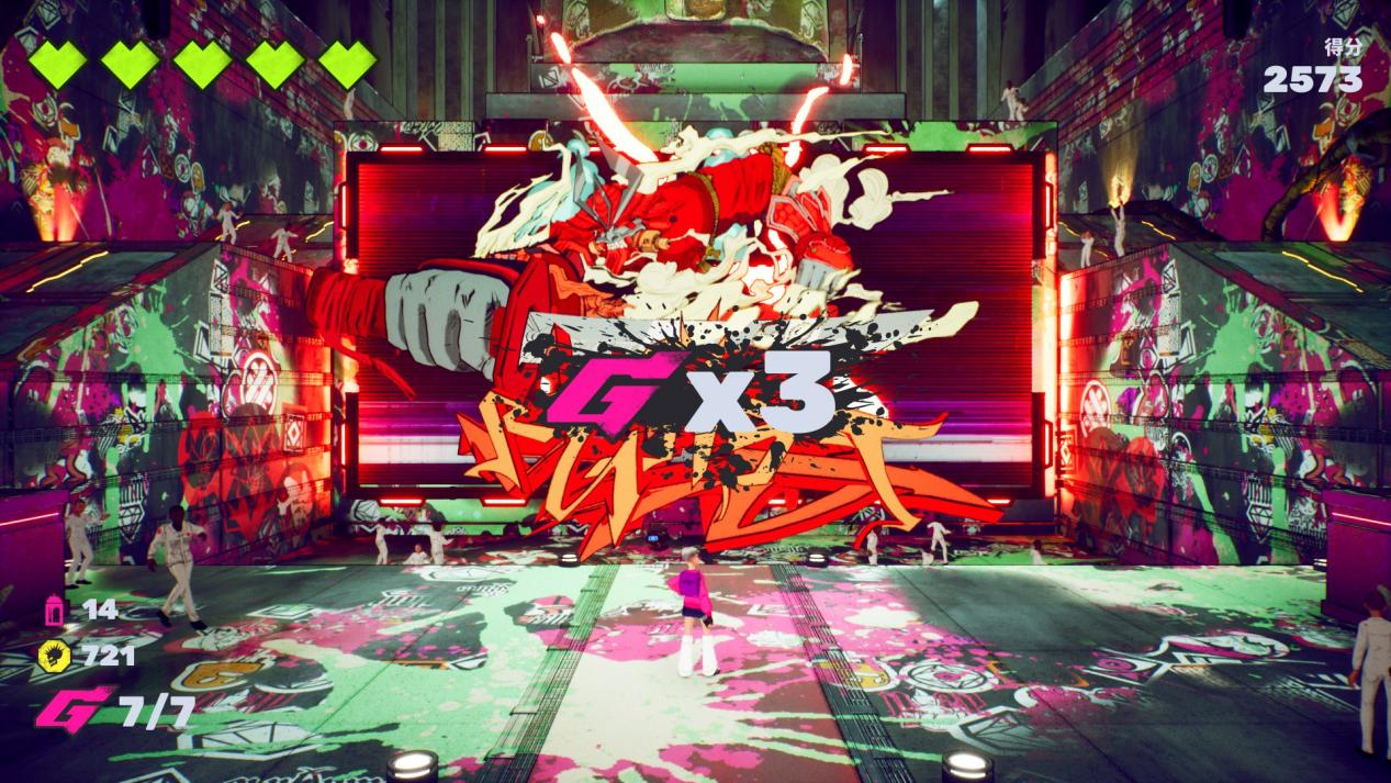 涂鸦的图案、角色的穿搭、气罐的颜色、喷雾的形状,《RKGK/Rakugaki》的一切客制化功能几乎都只与视觉体验有关,它几乎不能为玩家带来任何游戏性的提升。甚至可以说,当玩家通过了游戏的第一关,就已经能预料到游戏后续所有关卡的展开方式。