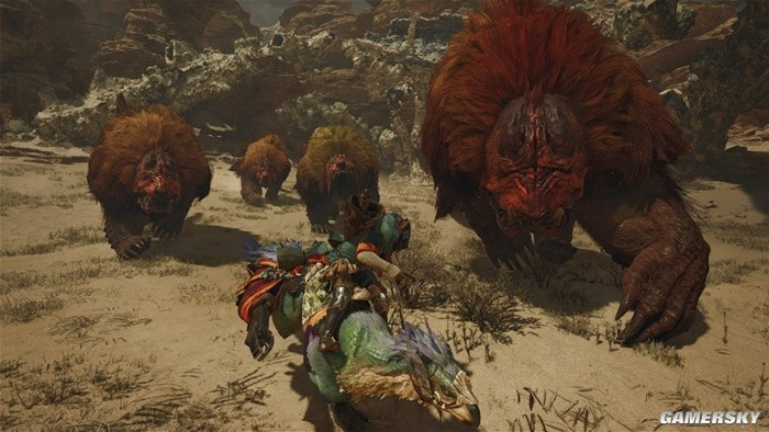 猎人可以很方便的骑乘鹭鹰龙通过导虫寻找到目标怪物辟兽首领。辟兽首领并非是独自行动的,它会和一群普通辟兽待在一起。和普通的辟兽比起来,首领的体型更大,同时身上的毛发也更红。