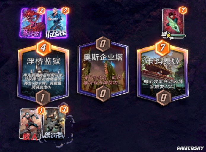 如果仅以上述提到的内容来看,《漫威:终极逆转》最多只是一个超快节奏的炉石混合昆特牌的休闲代餐。然而开发者在这套底层的玩法框架上添加了两个深度结合的系统,让《漫威:终极逆转》有了独树一帜的游戏性魅力,也是其真正能够在海外爆火从一众游戏中脱颖而出的原因。这两个系统分别是:每局变换莫测的场地系统;和影响玩家玩法期望的翻倍【英文版中即SNAP!】。