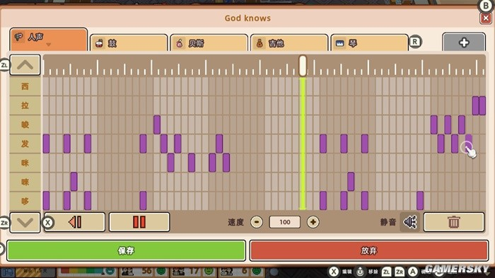 不过最让我惊喜的一点是,你在组织轻音社的学生活动时,还可以进入到一个手动打谱界面里,用人声、吉他、贝斯、琴、鼓等乐器来自由编曲。虽然每首曲子你都只能编写几个小节,但编写出来的曲子除了会在演出、练习时播放外,还可以被你手动设定成校歌或是上下课的铃声。