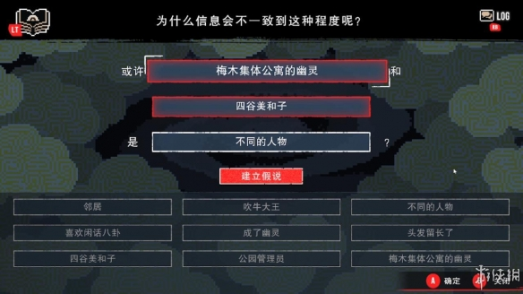 过往的推理游戏中,“提出假说”的过程是基于已有线索的观察和分析所展开的大胆猜测,是对当前情况的情报梳理,更是可能做到破局推进案件进度的关键步骤。在《都市传说解体中心》中,“提出假说”以一种完形填空的小游戏形式所体现,玩法思路别无二致,只需要在指定空白处填选正确的内容即可,内容的范畴也无外乎“人物、地点、时间、行动、原因”等关键要素,不过体验下来会发现这种完形填空的玩法少了几分头脑风暴的激烈,反而多了些咬文嚼字的古板,游玩时不止一次出现过只能“A和B”但不能“B和A”的固定格式问题,不知是不是因为中日文语法不同的问题所导致的,总之这种令人无语到发笑的体验确实不应该出现在一款主打逻辑推理的文字游戏中。
