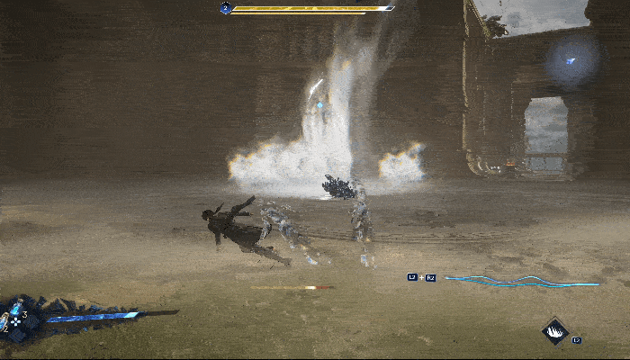 在大剑的重击动作开始时按下轻击,还可以派生出带有反击效果的动作。反击动作本身没有伤害,但如果过程中接触到敌人的攻击,就可以无效此次伤害并造成反击。另外还有一个比较有趣的设计是,使用大剑时玩家可以踩在剑上,将它当作滑板快速移动。在一些需要在关卡内跑酷或追击的流程中,这一能力相当实用。