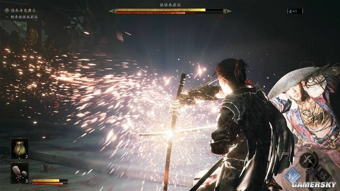 “力动”可以理解为敌人的架势条,当力动槽清空后,玩家即可对其发动必杀处决(崩一闪)。因此,在尚未完全掌握“一闪”机制时,玩家完全可以依靠“化劲”来偏转攻击,通过削减敌人的架势条触发“崩一闪”处决敌人。此时《鬼武者:剑之道》的体验与《只狼》是十分相似的。