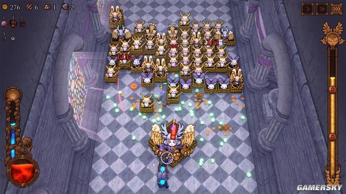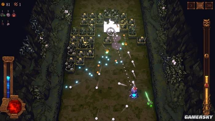 但这也面临着一个问题——你手上的弹珠量是有限的,必须要等它们回到底边被你自动回收后,才能进行下一轮开火。在缝隙内弹跳的弹珠固然输出爆炸,但在它们弹跳的这段时间内,你也完全没有自保能力,一旦有遗漏下来的敌人逼近,你也根本没有足够的火力用来应付它们。