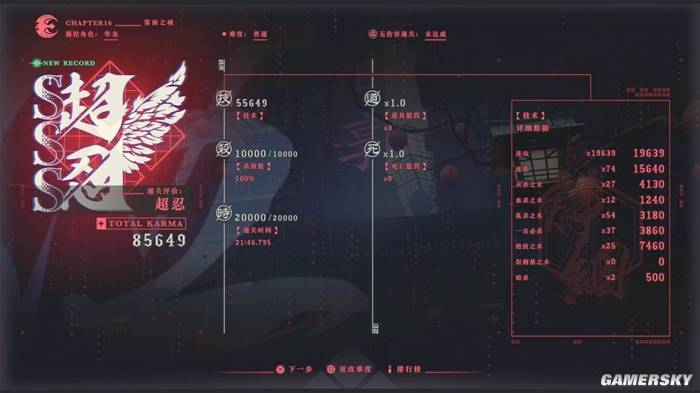 虽然听起来本作的难度很夸张,但其实稍有动作游戏基础的玩家都可以顺利通关。默认“英雄”难度基本上最适合新玩家体验,还带有自动闪避等辅助功能,“中忍”以上难度则需要系统性地学习一些战斗技巧。游戏的补给非常充足,玩家最多可持有5瓶小血药、3瓶大血药、3瓶持续恢复药,以及一枚“回生香”(复活药)。在非最高难度下,死亡次数多了还能得到免费补给,直到所有恢复药都到达上限。所以虽然结算评价可能会有点难看,但请尽情地重试,不要畏惧失败。