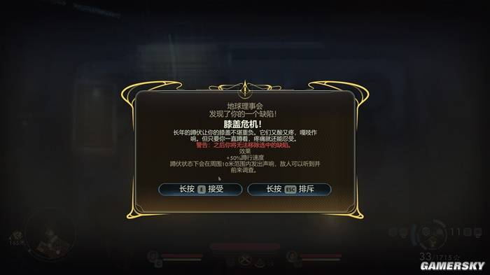 玩家可以选择是否接受这些缺陷,但一旦确认后就无法修改。就好比游戏开局我喜欢玩潜入流派,于是接受了一个“降低血量上限,同时降低仇恨”的缺陷,当我后期转为近战流时,这缺少的血上限会经常使我冲在前线时暴毙。当“做出选择并承担结果”这一RPG铁律回馈到屏幕前的玩家身上时,绝对是一次独特的角色扮演体验了。
