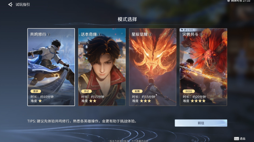 以本次试玩版本为例,在最基础的四个体验板块中,共鸣修行(战斗教学)、话本奇缘(奇遇传记)、星辰觉醒(英雄故事)三个单人板块基本都属于一次性挑战,而灾兽共斗则是需要组队刷装备、道具的长期主流玩法。
