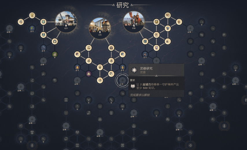 本作的科技树分“经济、公民、军事”三大方向,需先建立文法学院等建筑,并用学园提供的“知识”解锁。有的科技提供 Buff,有的解锁新建筑,且研究都需要花费一定时间。看这星罗棋布的科技树,就知道这游戏我前几小时也不过是刚玩了个开头而已。