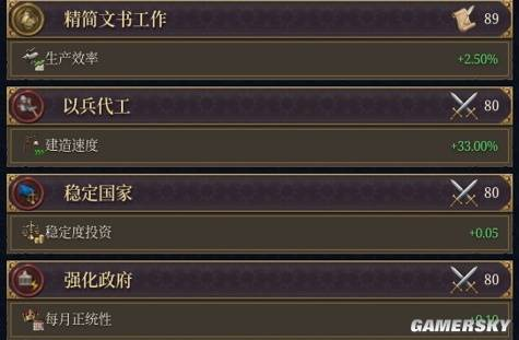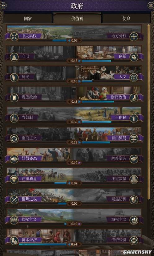 而你的每一项内政举措,都可能会影响到整个国家的价值观——是中央集权或是地方分权?创新或是守旧?每个价值观都会提供强力BUFF加成,但数值的高低与否,完全取决于你倾向某一侧有多极端。所以价值观的偏移是一个非常长期的过程,它会渗透在你内政的每一步操作中,而你也需要尽早做长期的规划才能达成目的。