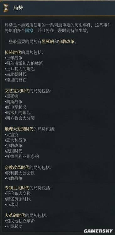 《欧陆风云5》中的局势事件共有23个,覆盖了本作的全6个时代。可以说,在《欧陆风云4》的使命树系统被删除之后,局势事件系统就是最能影响国家差异化的机制之一。