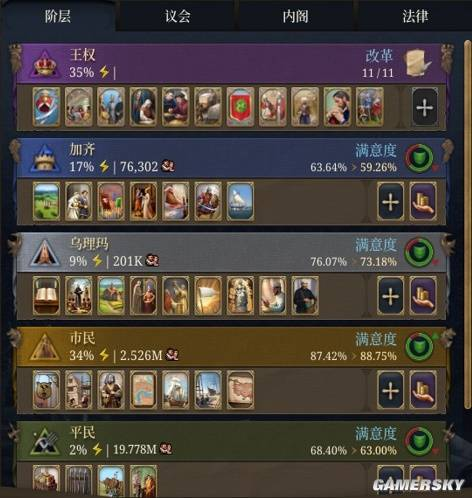 阶层的力量,还会影响到定期召开的国家议会——这个系统有点像《维多利亚》,力量越强的阶层,提出的议案支持率也就越多,而你如果想要在议会上提出另外的议题,比如更改法律、扩大税收等,就要通过满足阶层们的要求,来获取他们的支持率。
