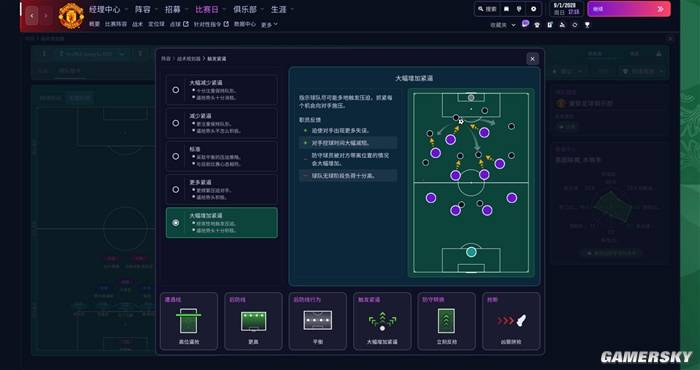 有一点值得注意的是,《足球经理26》的战术系统,明显进一步贴合了当今足球世界中正流行的压迫战术体系。它将压迫体系拆分成了高位、中位、低位三个环节,每个部分都可以选择主要防守方向是中路或边路,以便更好地利用球员能力和局部人数优势。