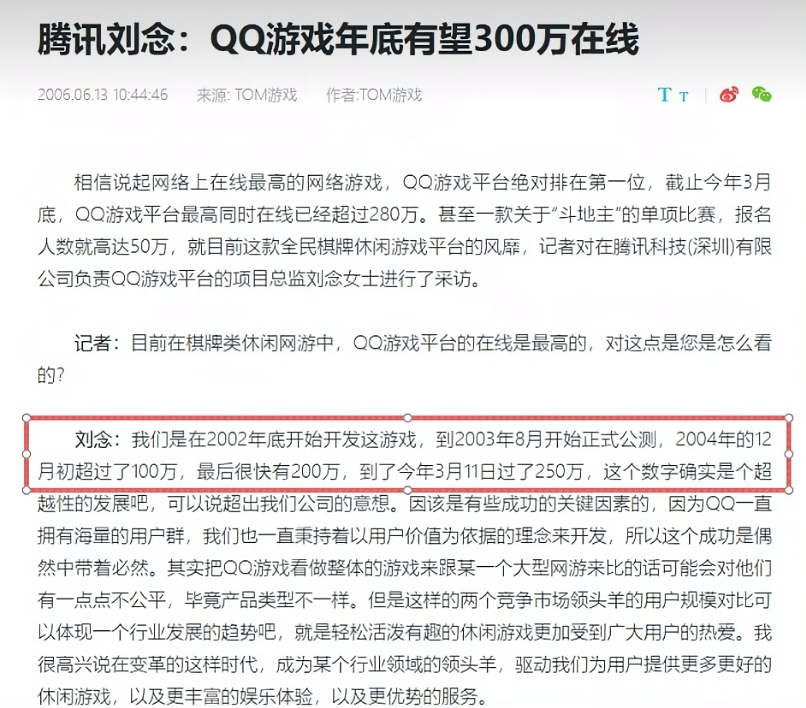 2004年,中国网民规模尚不足九千万,而QQ游戏大厅的最高同时在线人数却已突破百万,相当于每100个网民中,就有一个人是QQ游戏大厅用户。