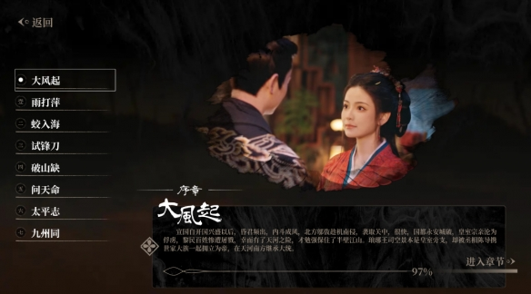 《江山北望》一共包括8个大的章节内容,按照制作组的传统艺能,他们在每个章节内都设置了多条分支剧情、隐藏剧情和不同结局,全剧情加起来的总时长超过了10个小时。