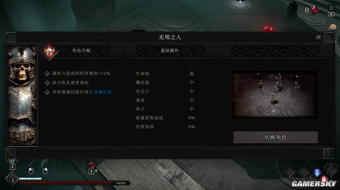 在此基础上,你还可以通过调整使用角色来进一步细化Build。因为虽说《冥界契约》的大部分武器都和使用角色绑定,例如骑士只能装备剑,狂战士只能装备斧,法师、游侠则是法杖、弓箭等,但最后解锁的“无用之人”可以装备全类型武器,而他则拥有体力回复增益相关的天赋,这就可以弥补一些短腿角色的短板,或是让你不装备盾卫自带的格挡技能从而尝试走其他流派。