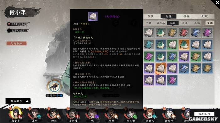 当然了,《息风谷战略》还存在着许多值得商榷的小问题。比如人物选择界面的UI过于狭窄,后期人多时依靠拖拽来选人十分繁琐;比如秘籍种类太多,但并没有进一步可以进一步筛选的子菜单,图标虽然会在书籍封面画出剑、弓等形状,但非常不直观,也难以让人快速辨认。