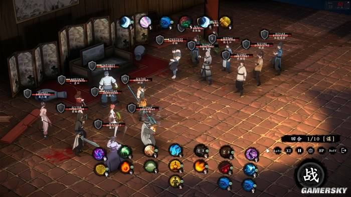 只有宣战后的势力,才会允许双方互相攻伐,并进入到一个独立的回合制战斗模式里。战斗部分的整体理念与《战国兰斯》相似,角色被分成了铁壁(坦克)、千刃(近战输出)、百草(治疗)、极目(射手)等许多种职能,只不过除了你所下达的指令外,角色每回合还会对面前的敌人发动普攻,玩起来颇有种自走棋的感觉。同时由于每位角色一回合内的参战次数有限,所以你要做就是通过合理的排兵布阵,用尽可能少的人数去击败对方。