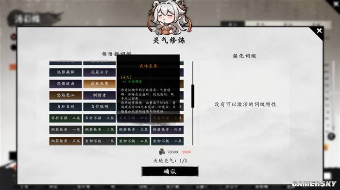 在《战国兰斯》中,每当你和角色达到一定好感值时,都可以触发一次强化,而《息风谷战略》里同样有类似的系统——即“气运修炼”。它可以让你在一个庞大的词条库里自选人物特性,从而强化基础属性或增加各种被动技能,来补全角色短板、或是让长板变得更加突出。