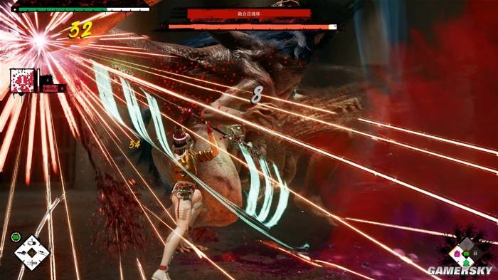 除此之外,战斗中还有一个令人印象深刻的机制。使用武器攻击可以收集敌人的血液,当血液槽积攒满后,即可发动名为“血色夏日”的特殊攻击。触发“血色夏日”时有非常酷炫的演出效果,不仅能对敌人造成高额的范围伤害,还能恢复一定量的生命值。