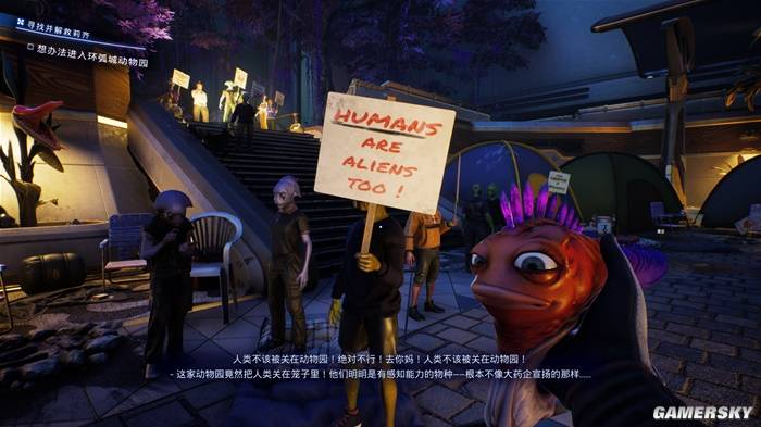 在这样的背景下,游戏对外星社会的描绘透着一种别样的诡异感。人类在这里并非主流种族,甚至被视为珍禽异兽。因此,当你走进外星人的动物园时,会看到醒目的“人类园区”,其中不仅有被圈养的人类展柜,甚至还有“可供触摸体验”的互动区。