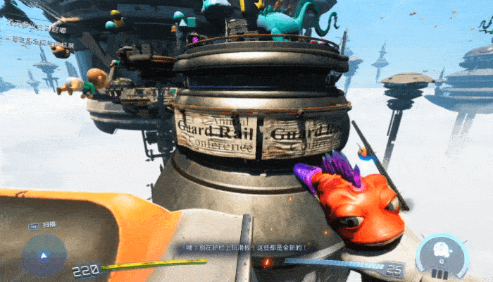 除了手里的武器之外,主角这次的机动性也迎来了大加强。全新引入的滑板系统改变了游戏的节奏,玩家可以随时召唤滑板进行高速移动,在场景中随处可见的栏杆上滑行,或者冲上坡道进行加速飞跃。