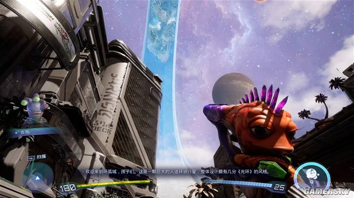 游戏的舞台主要位于一个巨大的“光环”天体“环弧城”上……没错,设定与大名鼎鼎的《光环》颇为相似。这个环形世界拥有“市中心”、“海滩”和“动物园”三个风格迥异的大区域。除了“环弧城”外,游戏中玩家也可造访其他外星世界,甚至在某段流程中还有机会重返地球冒险。