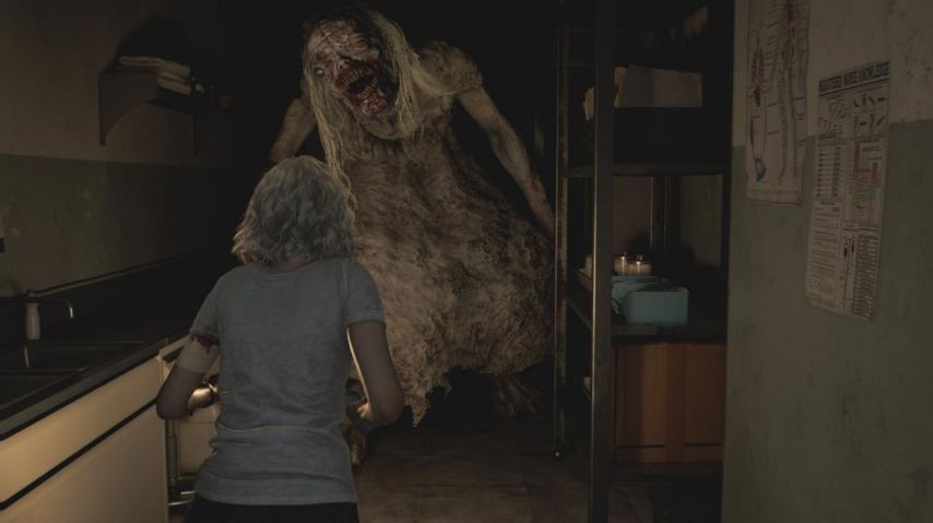 即便和近一些的《生化危机7》相比,《安魂曲》的恐怖效果也显得比较一般,丧尸们与其说是恐怖,不如说是恶心,他们黏糊糊,脏兮兮,臭烘烘,然后偶尔搞个 Jump Scare 吓唬人,真正让人从心底发慌的瞬间并不多,和走日式心理恐怖的《生化危机7》相比还是太嫩了点。肉山一样的巨型丧尸和屠夫丧失,也没了当年暴君的窒息感,里昂的加入更冲淡了游戏的压迫感——他在游戏后期简直可以和奎爷拼上几个回合。