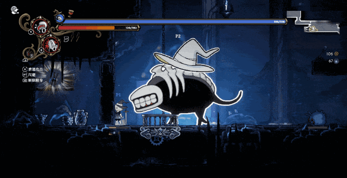由于附身的敌人拥有独立的血条。因此附身实际上也增加了玩家的容错。本作的战斗难度尤其是Boss战难度并不算低,整体略低于《空洞骑士》的平均水平。尤其在一局游戏中不断深入后,敌人的伤害数值会迅速提升。而本作的build并不是能让玩家挂机滚键盘也能过关的强度,因此对玩家的操作也有一定要求。