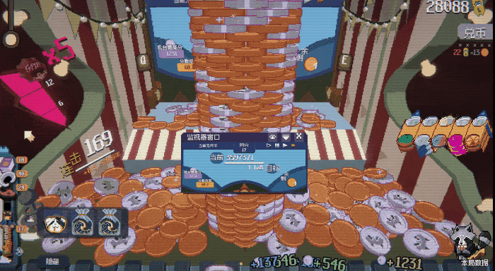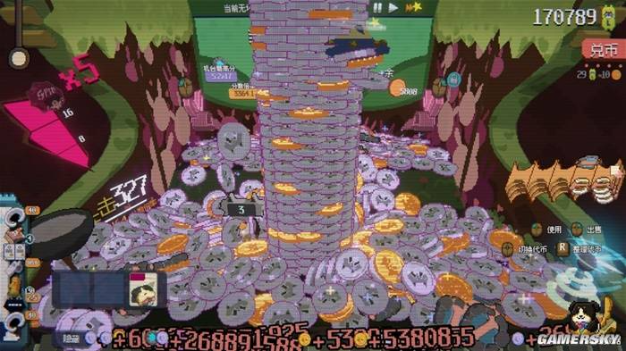只要持续不断地获取代币,就能为你积攒连击条,并且开启奖励转盘。它或许给你下一场金币雨,或许能赠送一些关键道具,也可能出现终极大奖——砌出一座由几百个币堆积而成,高耸入云的币塔。