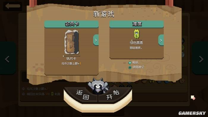 《浣熊推币机》比较有特色的一点是,每次开局时,你能调整的除了会员卡(相当《小丑牌》里的不同牌组),以及难度选项外,还能选择不同的角色。