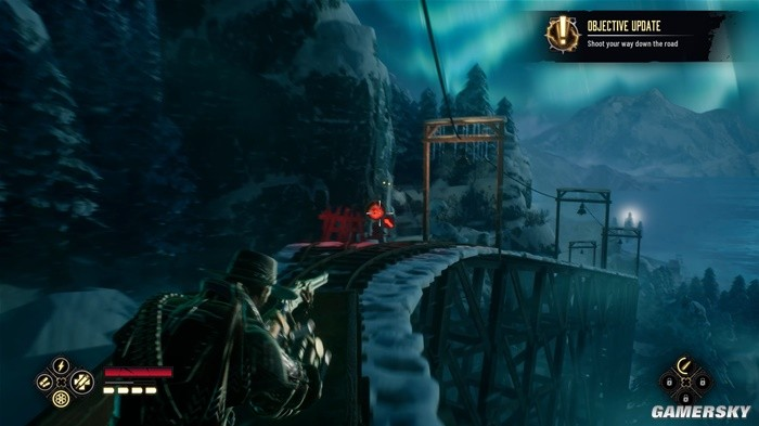 试玩中有一段紧张刺激的过山车桥段,需要玩家在车上及时打用枪打掉炸药桶或变向杆来保持路线畅通,还是相当刺激的