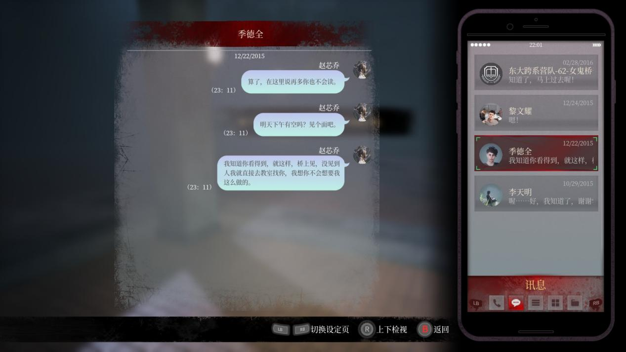 这种手法比起电影原作来说,更加着重于刻画剧情中几个人物的形象。毕竟,原作中的叙事诡计,需要隐藏很多细节来保证不会提前“露馅”,游戏中就不存在这样的顾虑,而有很多关于“女鬼桥”这一怪谈的背景资料,也能够通过不同人的视角来进行补充。